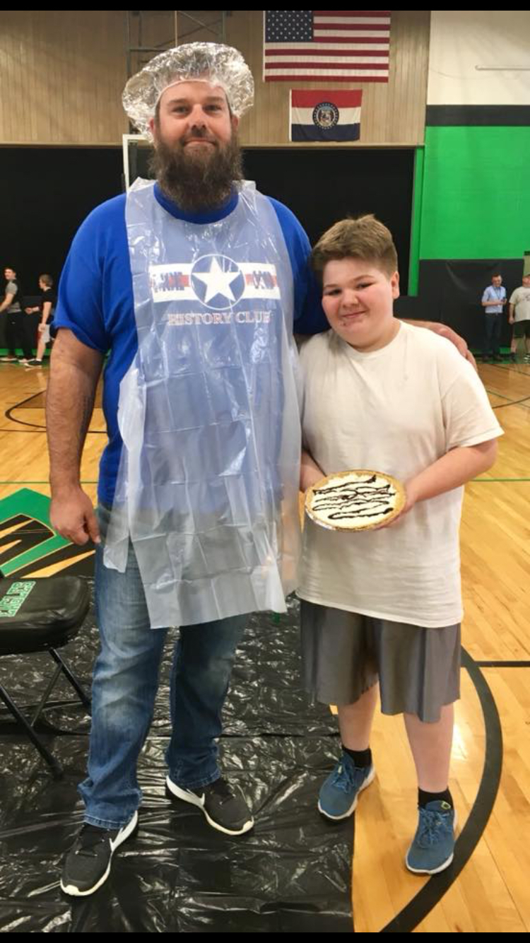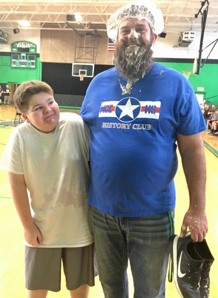 Mr. Stokes received the most student votes, making him the recipient of a “pie in the face”! Fifth grade student, Alex Davis earned the honor of throwing the pie by selling the most raffle tickets for a P.I.E. fundraiser.